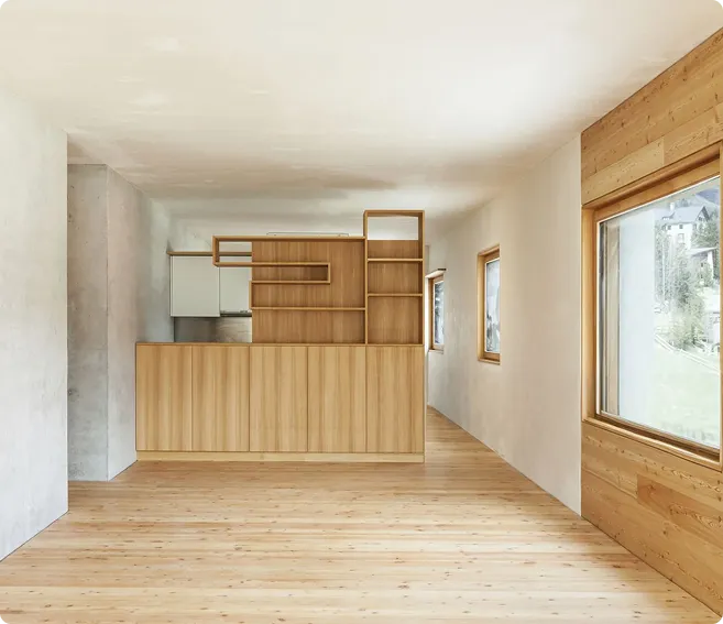 präzise erfasst. Auf dieser Basis erfolgt die Fertigung der jeweiligen Holzbauteile. Durch diese Vorgehensweise entstehen passgenaue Lösungen, die sich technisch sinnvoll in bestehende Räume integrieren lassen.